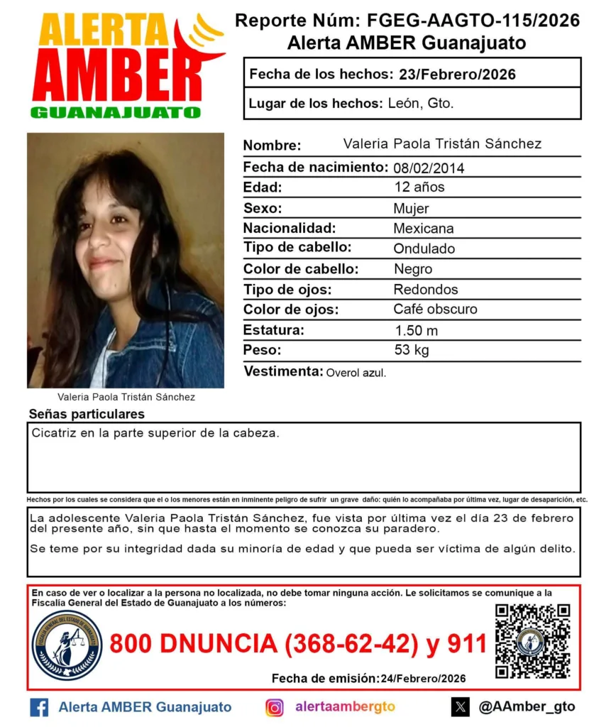 León, Guanajuato - Alerta Amber difundió una ficha para localizar a la adolescente Valeria Paola Tristán Sánchez, de 12 años, quien fue vista por última vez el 23 de febrero de 2026.
