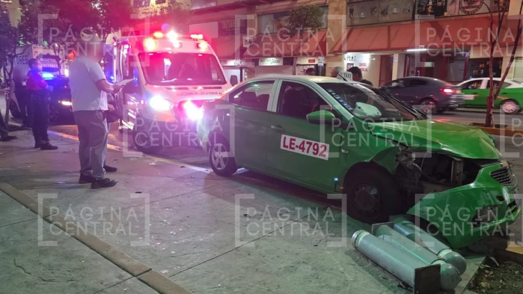 Sin embargo, debido a la inercia de la maniobra, el taxista perdió el control, subió a la banqueta e impactó contra los postes de contención, derribándolos por completo.