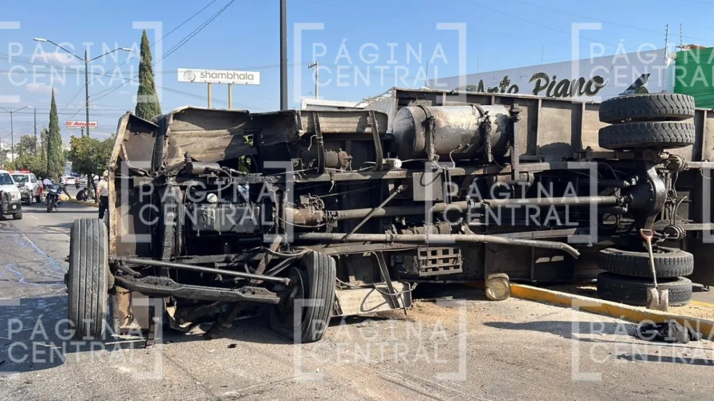 León, Guanajuato - En los cruces del bulevar Juan Alonso de Torres y a metros del Paso de los Insurgentes, un tractocamión tipo tolva perdió el control y volcó sobre varios carros.