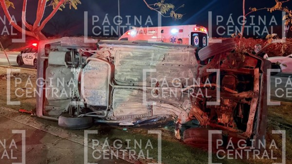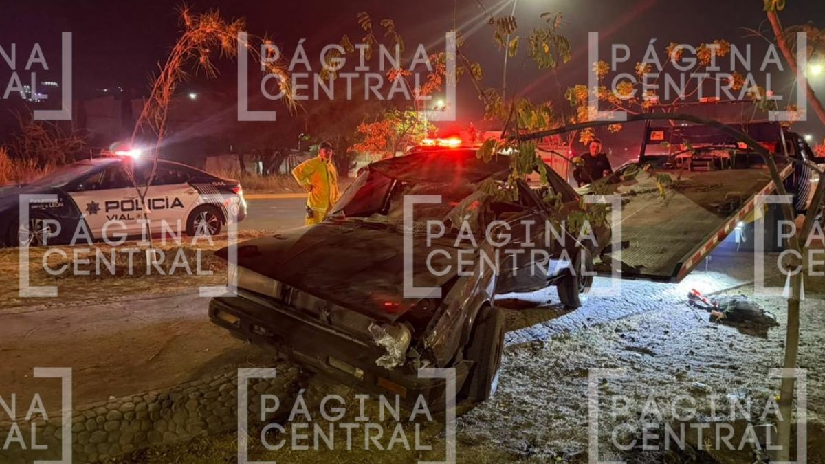 León, Guanajuato - Un aparatoso accidente vial se registró la noche del domingo en el Eje Metropolitano, donde un automóvil terminó completamente volcado tras perder el control.
