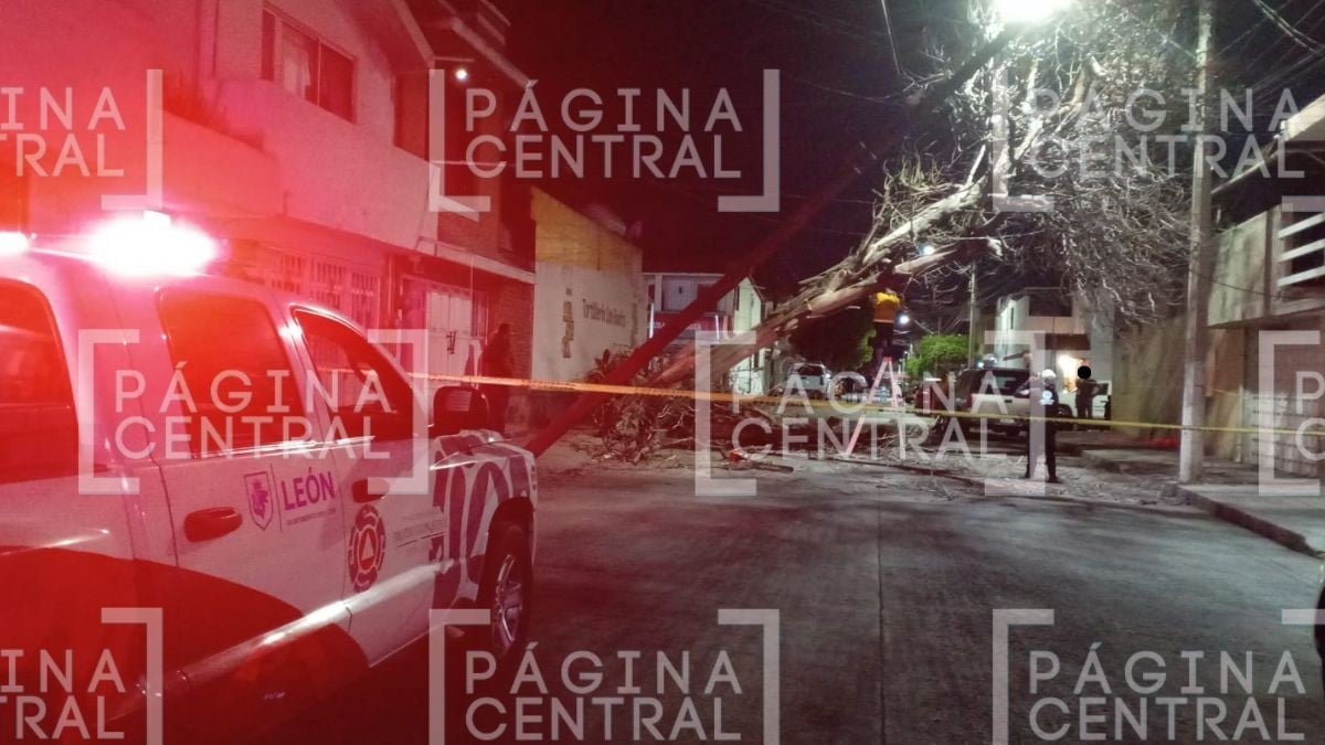 León, Guanajuato - Los fuertes vientos registrados en León provocaron la caída de árboles en distintas zonas, destacando incidentes en Jardines de Jerez y la colonia Los Ángeles.