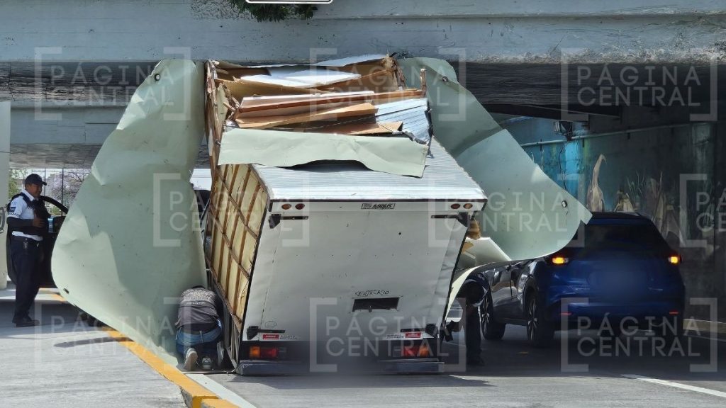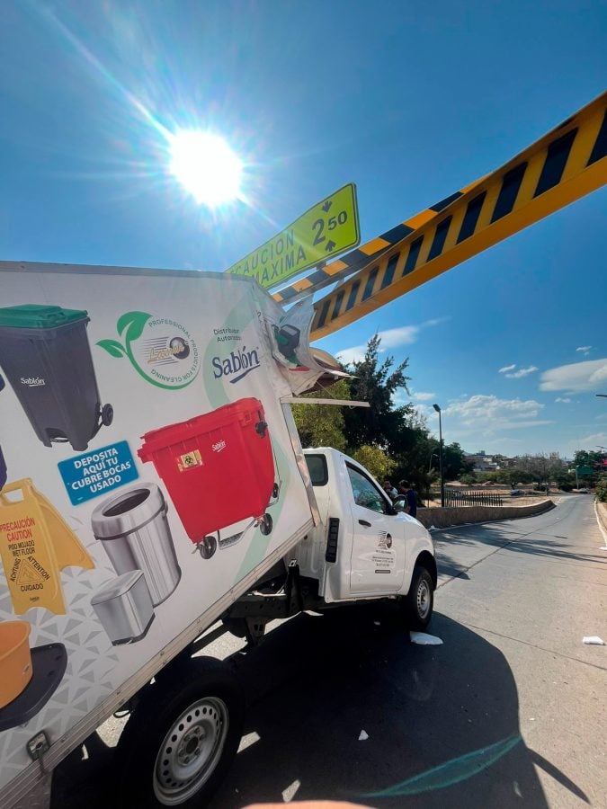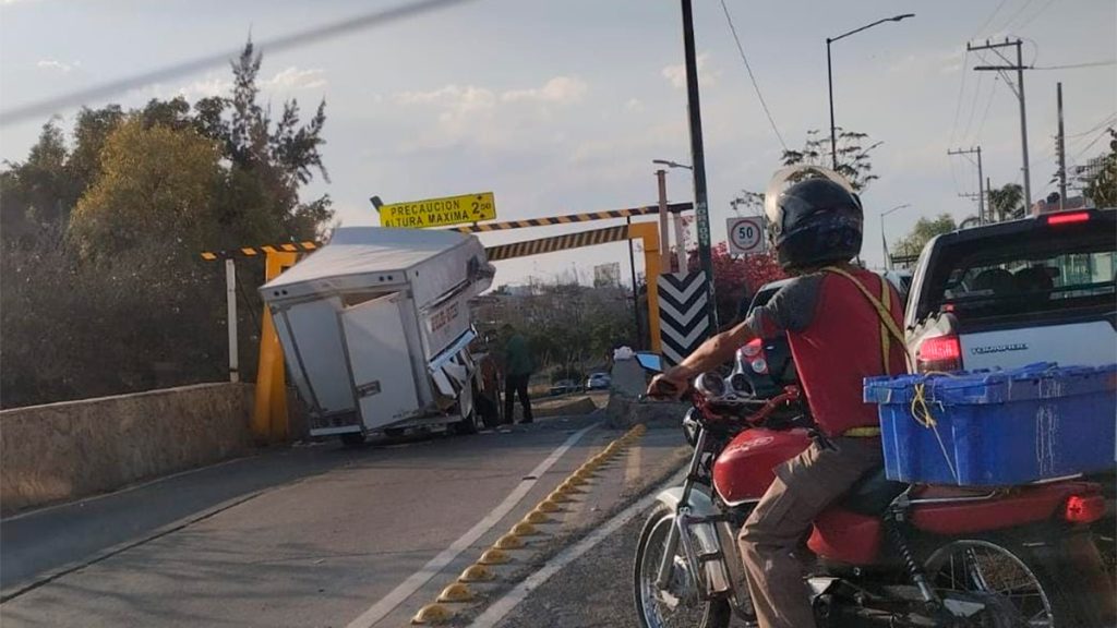 Los hechos se registraron aproximanente a las 8:44 de la mañana, cuando el conductor de la camioneta intentó bajar por el desnivel a la altura del Puente del Amor con dirección al bulevar Juan José Torres Landa, pero la altura de la caja topó con el marco de acero.
