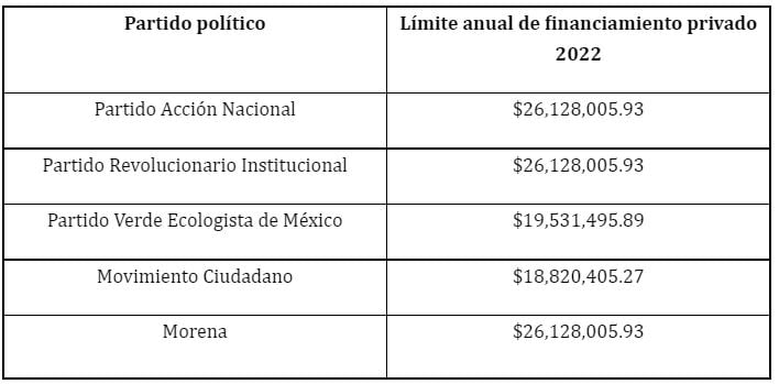 Los límites del financiamiento privado que podrán recibir los partidos políticos por aportaciones de militantes y simpatizantes durante el ejercicio 2022, se desglosan a continuación: