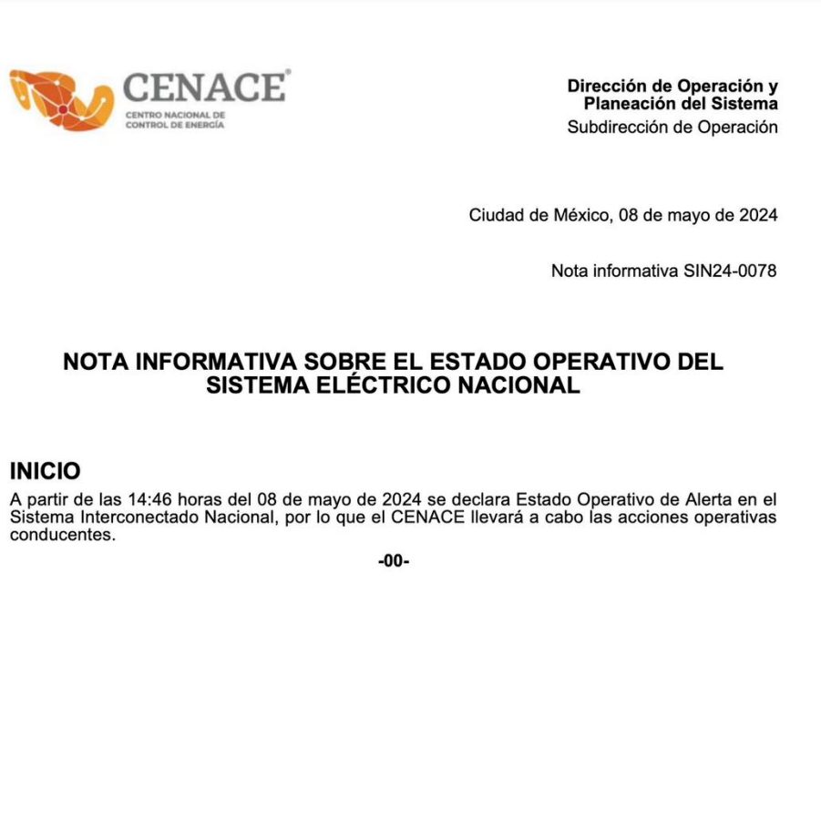 El miércoles 8 de mayo, el Centro Nacional de Control de Energía (Cenace) emitió una alerta en el Sistema Interconectado Nacional, ante la alta demanda energética provocada por las altas temperaturas.