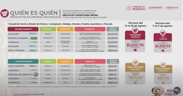 El precio más elevado de la canasta básica se ubicó en Tiendas Ley sucursal Hidalgo. Otros productos que se revisan y que forman parte de la canasta básica es el aceite vegetal, arroz en grano, azúcar estándar, carne de res, chile jalapeño, carne de cerdo, limón, manzana, pasta para sopa, sardina en tomate en lata, entre otros.En tanto, en la zona centro del país, el precio más alto fue en Walmart Naucalpan de mil 20.70 pesos, lo que representó 13 pesos más baratos que en León, quien reportó la semana pasada el precio más alto, de mil 33.75 pesos”, comentó.