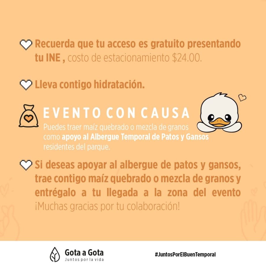 En esta ocasión y para hacer un encuentro con doble causa se pide llevar maíz quebrado y alimento para los patos que están en un albergue temporal.