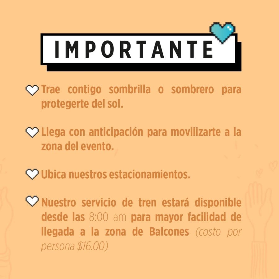 Es importante tomar en cuenta que al ser a las 10 de la mañana y que las altas temperaturas están sobre los cerca de los 38 °C, debes llevar sombrilla, sombrero, cachucha, ropa ligera, bloqueador, líquidos para hidratarse y para protegerse del sol, además de llegar con tiempo anticipadamente para llegar a la zona del evento y ubicar los estacionamientos.
