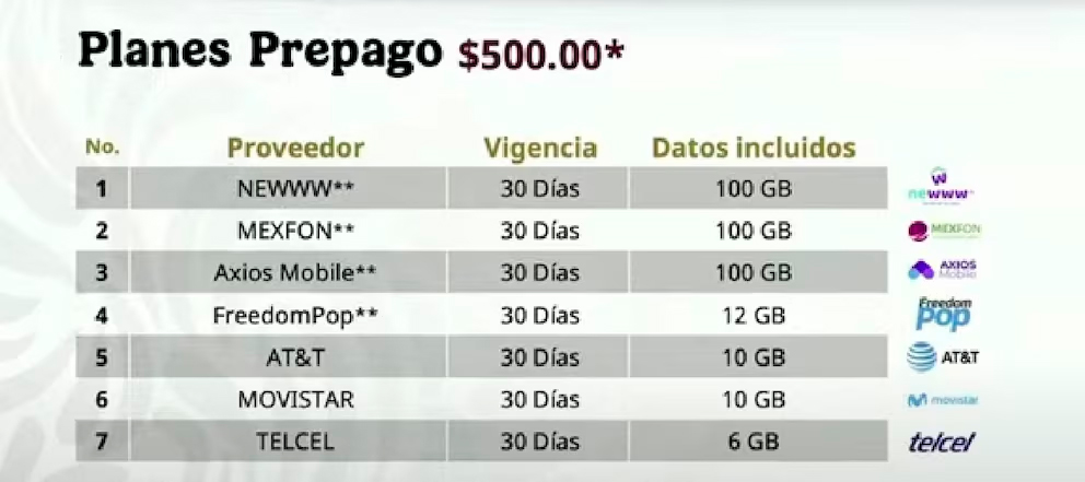 En recargas de 500 pesos, Telcel se posicionó como una de las empresas con menor oferta, proporcionando solo 6 GB con una vigencia de 30 días. En contraste, otras compañías como NEWWW, MEXFON y Axios Mobile ofrecieron 100 GB por el mismo monto y vigencia. Freedom Pop destacó con 12 GB, mientras que AT&T y Movistar ofrecieron 10 GB cada una.