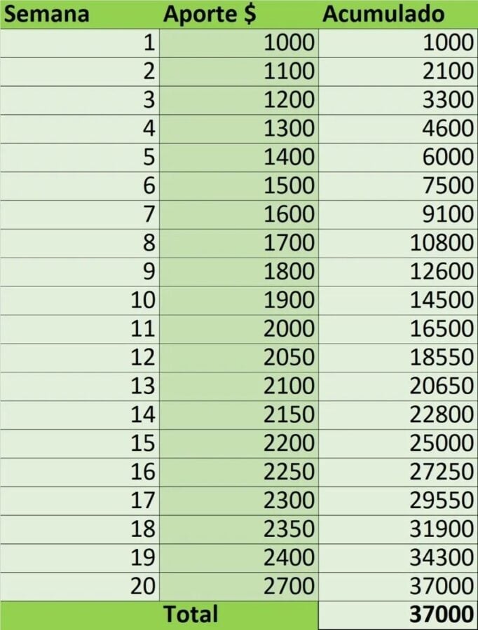 Finalmente, la semana 20 te exige un mayor esfuerzo para que aumentes 300 a tu ahorro semanal, para que así puedas lograr un ahorro de 37 mil pesos en 20 semanas.
