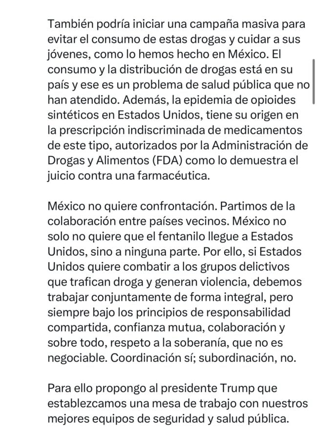"Las organizaciones mexicanas de narcotráfico tienen una alianza intolerable con el Gobierno de México. El Gobierno de México ha proporcionado refugios seguros a los cárteles para que se dediquen a la fabricación y el transporte de narcóticos peligrosos, que en conjunto han provocado la muerte por sobredosis de cientos de miles de víctimas estadounidenses", apuntó.