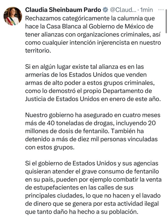 "Rechazamos categóricamente la calumnia que hace la Casa Blanca al Gobierno de México de tener alianzas con organizaciones criminales, así como cualquier intención injerencista en nuestro territorio", manifestó mediante una publicación en su cuenta de X.