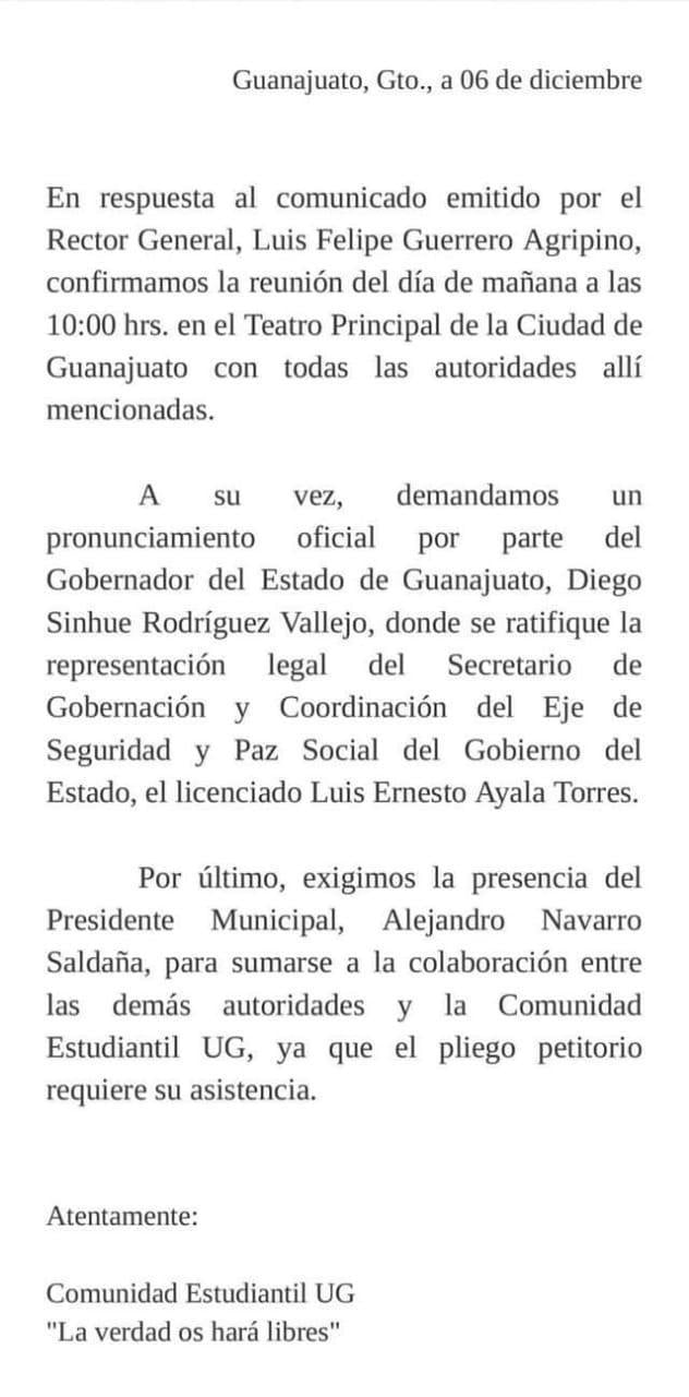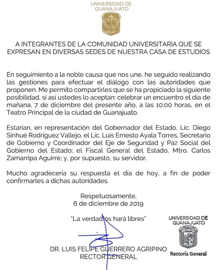 El rector de la Universidad de Guanajuato (UG), Luis Felipe Guerrero Agripino, envió un comunicado a los estudiantes para solicitar su anuencia y reunirse este sábado en el Teatro Principal de esta ciudad, aunque en esta ocasión sin la presencia del gobernador, Diego Sinhue Rodríguez Vallejo.
