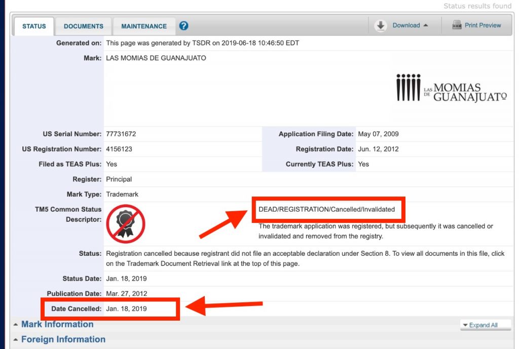 Por lo pronto, en Estados Unidos cualquier persona puede registrar la marca “Momias de Guanajuato” sin que la Oficina de Patentes y Marcas de Estados Unidos (USPTO, por sus siglas en inglés) tenga inconveniente, pues el antiguo titular, el Municipio de Guanajuato, dejó vencer el registro.