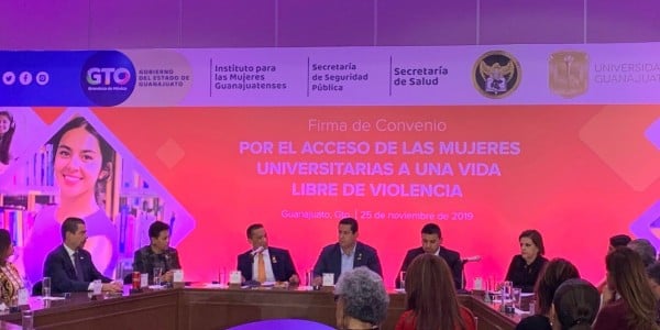 No podemos permitir que la violencia en cualquiera de sus manifestaciones siga lastimando a las mujeres guanajuatenses porque la cultura de no violencia a las mujeres es la que hace a nuestra sociedad civilizada", dijo el gobernador de Guanajuato, Diego Sinhue Rodríguez Vallejo.Con ello se busca que las universidades sean libres de cualquier tipo violencia para las mujeres, pues el Sistema Nacional de Información de Estadística Educativa de la Secretaría de Educación el 50.4%, de los estudiantes universitarios del estado son mujeres. Las dependencias que firmaron el acuerdo son la Secretaría de Seguridad Pública del Estado, Secretaría de Salud de Guanajuato, Instituto para la Mujeres Guanajuatenses y la Fiscalía del Estado, así como la Universidad de Guanajuato. Según la Encuesta Nacional sobre las Dinámicas de las Relaciones en los Hogares, el 25.2% de las mujeres de 15 años y más han tenido algún incidente violento a lo largo de vida escolar, de estas el 18% fueron violencia física, 9.3% de violencia emocional y 9.2% por violencia sexual. *R