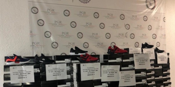 Elementos de la Policía Federal Ministerial aseguraron más de 200 pares de tenis pirata.