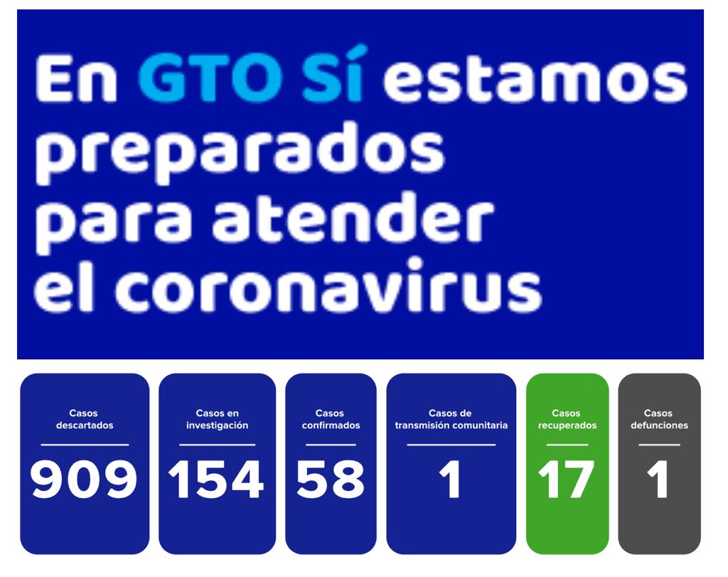 Hasta el momento hay un 58 casos confirmados, una defunción, 154 casos en investigación, 909 casos descartados y 17 personas dadas de alta. Los nuevos casos se dieron en el municipio de Abasolo uno, y los otros tres en Salamanca.