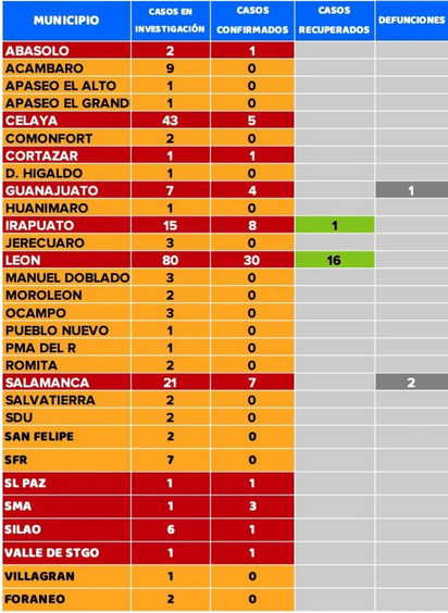 Así van los contagios hasta este martes: Abasolo (1), Celaya (5), Cortazar (1), Guanajuato (4) San Miguel de Allende (3), Irapuato (8), León (30), Salamanca (7), San Luis de la Paz (1), Silao (1), Valle de Santiago (1).