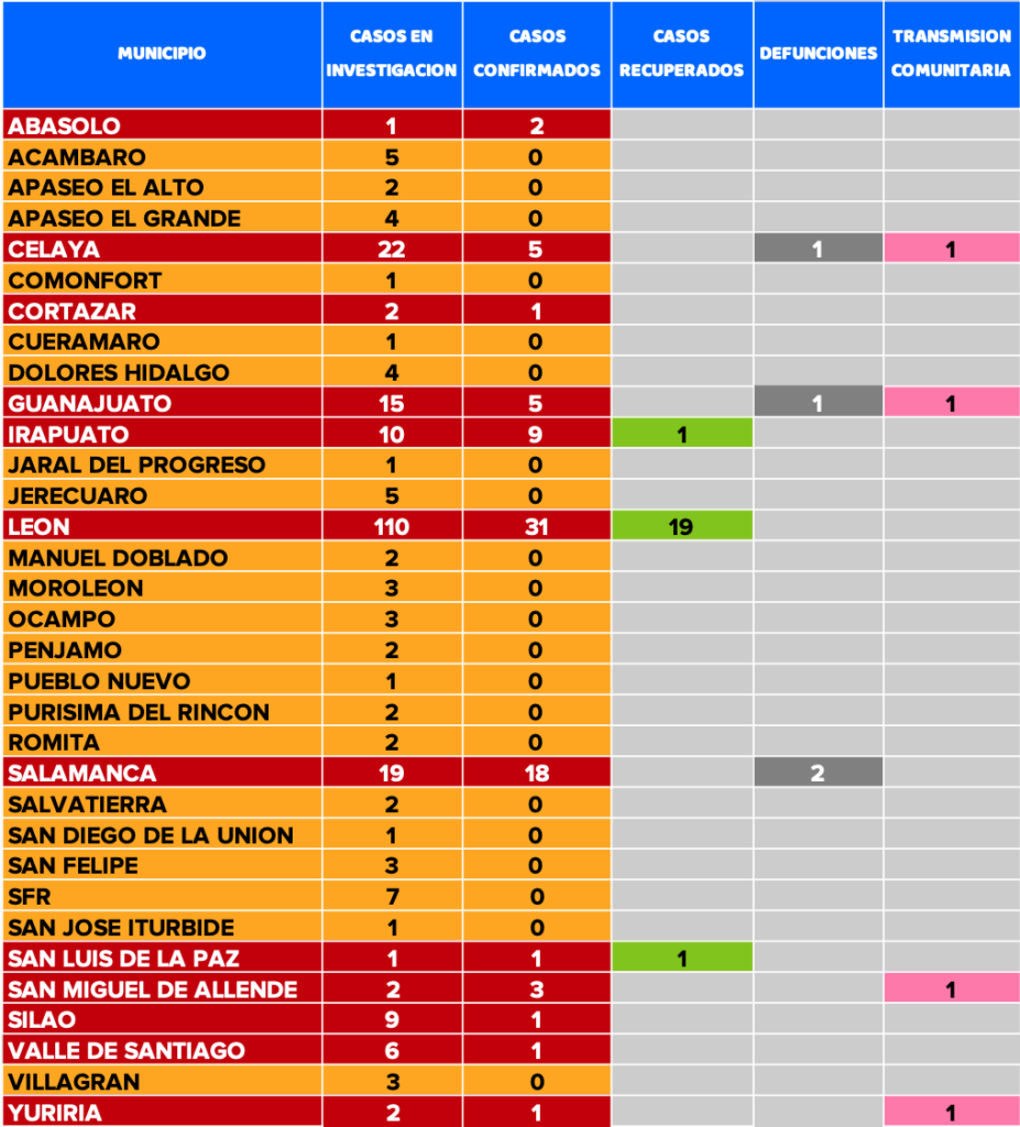 Se confirmaron cuatro casos de transmisión comunitaria en los municipios de Celaya, San Miguel de Allende, Guanajuato y Yuriria.