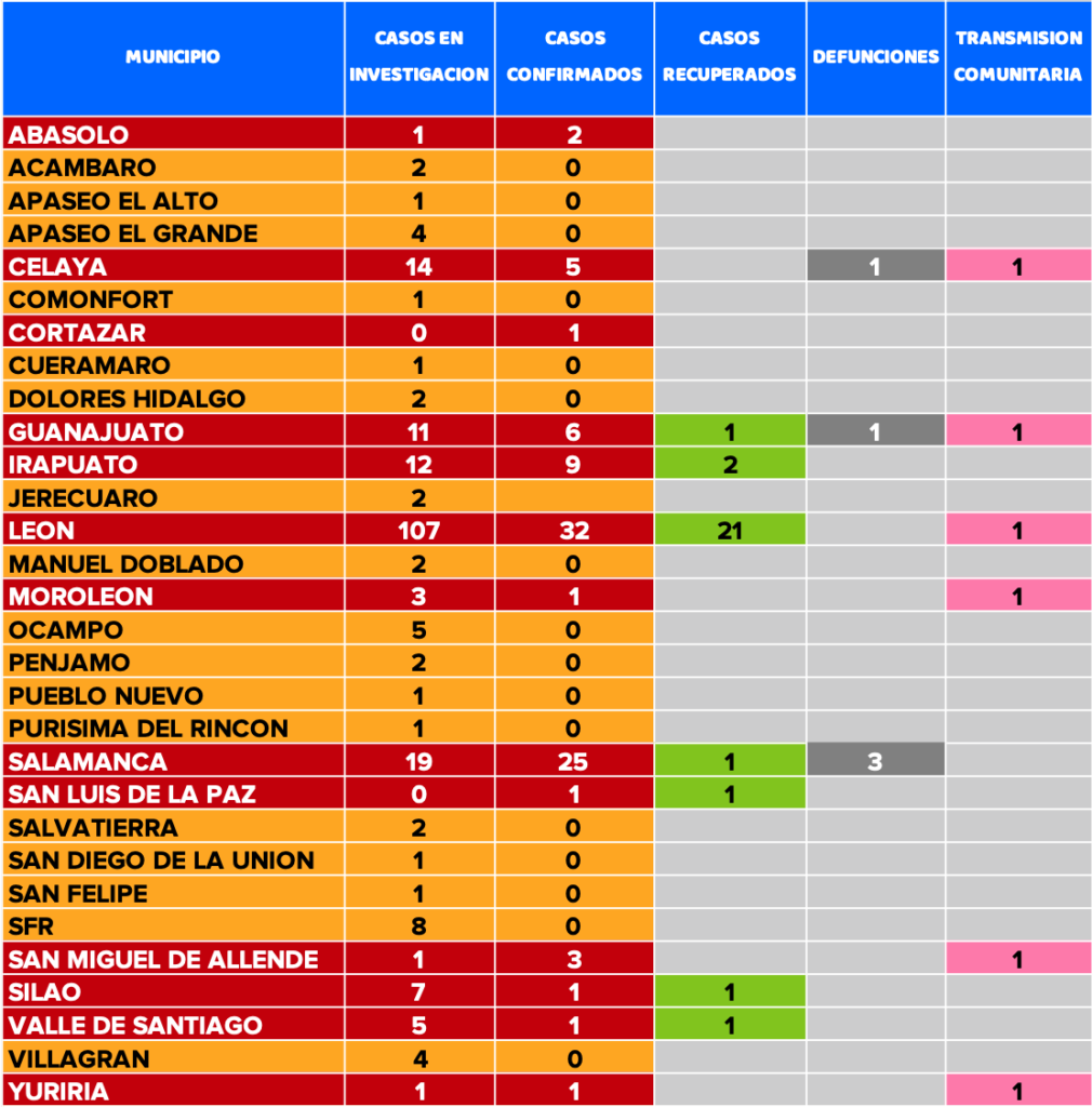 En los municipios de Guanajuato, Irapuato, Salamanca, Silao, San Luis de La Paz y Valle De Santiago también se reportan casos en recuperación.