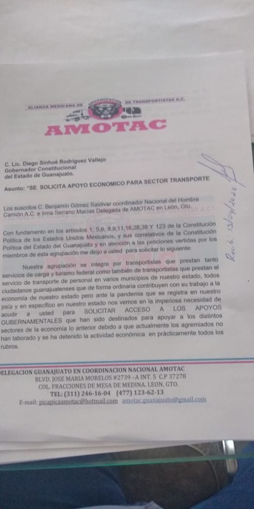 “Nuestra organización se integra por transportistas de carga y de turismo federal, así como transportistas que prestan servicios de traslado de personal, quienes de forma ordinaria contribuyen con su trabajo a la economía del estado, por tal razón pedimos acceder a los apoyos económicos anunciados por el gobierno estatal hace unos días “, dijo.