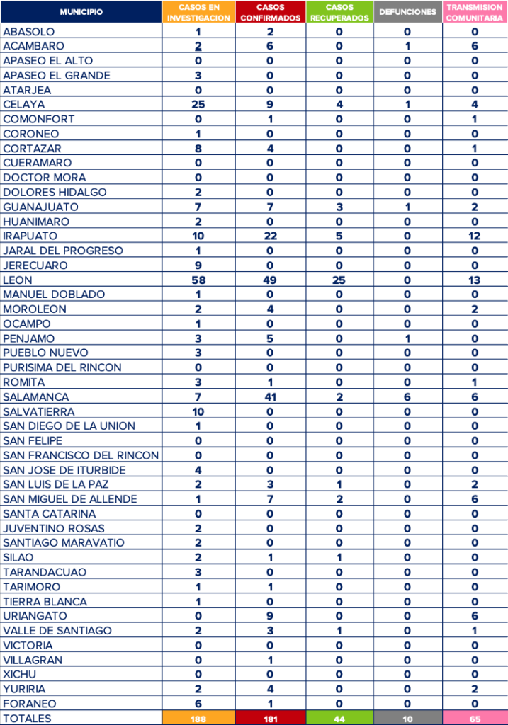 La SSG a través de su portal coronavirus.guanajuato.gob.mx dio a conocer que en el estado de Guanajuato ya se registran 181 casos confirmados de coronavirus.