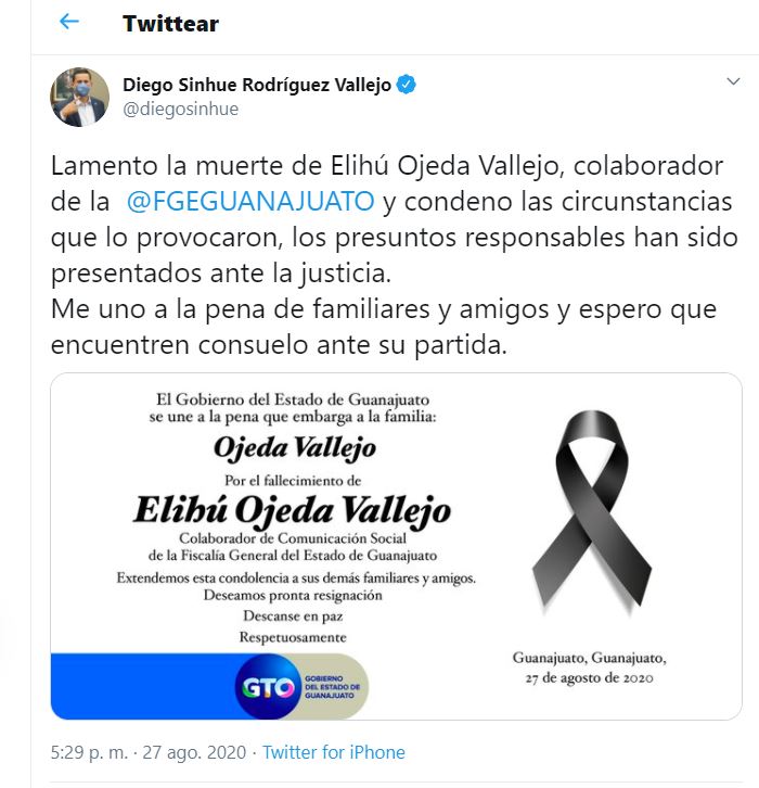 El gobernador del estado, Diego Sinhué Rodríguez Vallejo lamentó la muerte de Elihú Ojeda Vallejo y condenó las circunstancias que provocaron su deceso; de los presuntos responsables dijo que ya habían sido presentados ante la justicia.