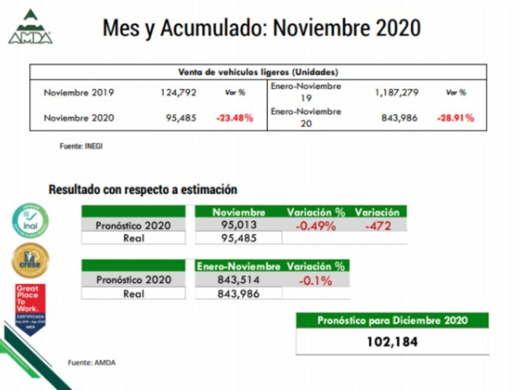 En noviembre de este año se alcanzó la venta de 95 mil 485 unidades comercializadas contra noviembre de 2019 en la que se concretaron ventas por 124 mil 792 unidades vehiculares, con una caída del 23.5%.