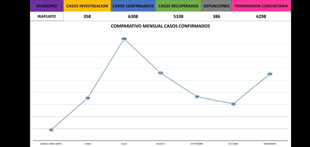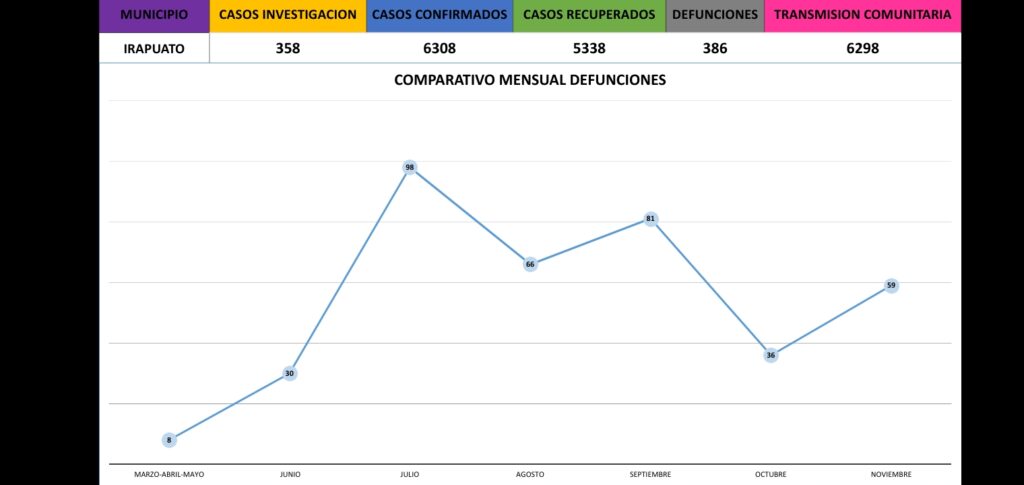 Relajar las medidas sanitarias, como el uso correcto del cubrebocas y realizar o acudir a reuniones, provoca un incremento en los contagios y fallecimientos por covid-19 en Irapuato de hasta 81% durante noviembre.