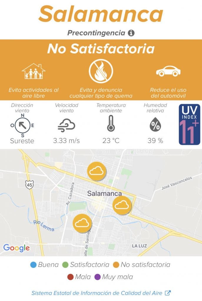 La precontingencia en Salamanca se activó a las 8:30 horas en la estación Nativitas con un promedio móvil de 147.84 µg/m3, con promedio horario de 108 µg/m3, a la misma hora, con dirección de viento predominante del Sureste.