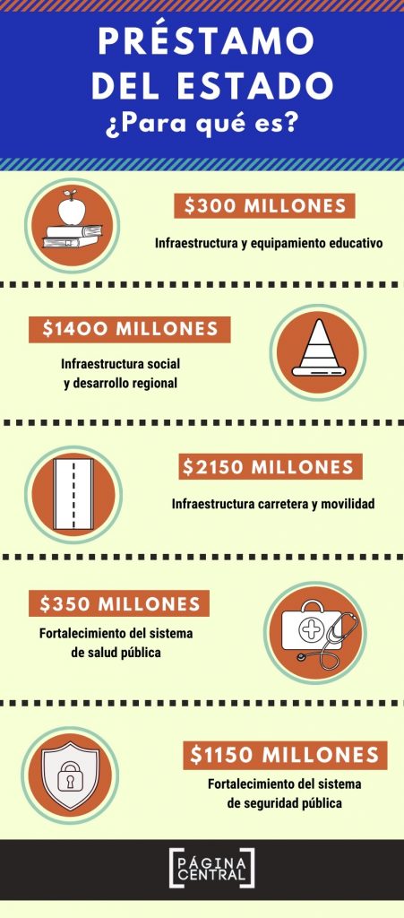 “Se invertirá en cinco rubros: 300 millones de pesos para infraestructura y equipamiento educativo; mil 400 millones de pesos para infraestructura social y desarrollo regional; 2 mil 150 millones de pesos para infraestructura carretera y movilidad; 350 millones de pesos para el fortalecimiento del sistema de salud pública y mil 150 millones de pesos para el fortalecimiento del sistema de seguridad pública”, detalló.