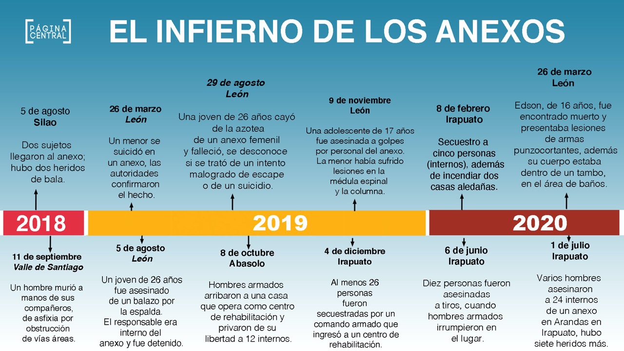 Los Centros de Rehabilitación o anexos en Guanajuato, además de haberse convertido en semilleros de la delincuencia y ‘cárceles’, también se han ubicado como un blanco cada vez más frecuente de grupos delincuenciales. A la fecha con un saldo de al menos 34 muertos.