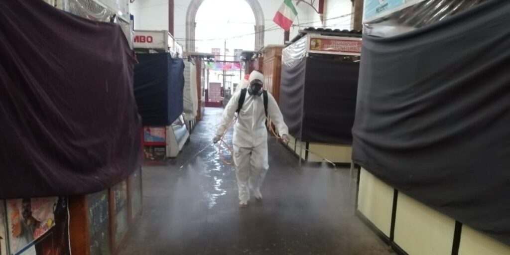 Posteriormente la Brigada Sanitizante se concentró en el exterior e interior del Mercado Hidalgo, para limpiar y desinfectar todas las superficies y el mobiliario de este importante centro de abasto para los guanajuatenses.
