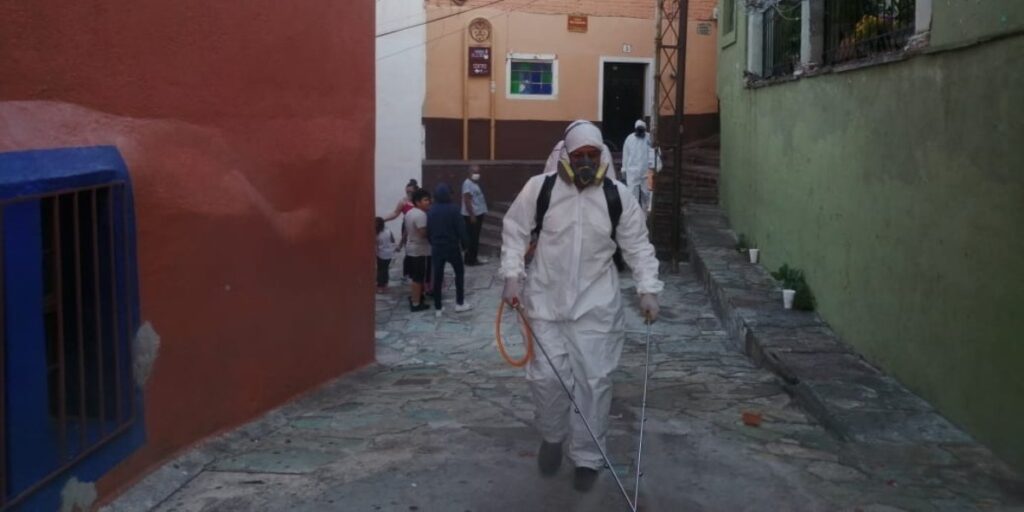 La brigada recorrió los callejones y plazuelas de la ruta, donde sanitizó el mobiliario urbano y las superficies de uso común de uno de los principales atractivos turísticos de la ciudad de Guanajuato.