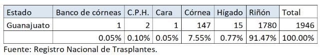 Hace unos días el Centro Nacional de Trasplantes (Centra) dio a conocer las bases de datos sobre trasplantes; se ubica a Guanajuato como el tercer lugar a nivel nacional en cuanto al número de pacientes en lista de espera con mil 946 personas; representan el 8% del total a nivel nacional.El primer lugar lo tiene Jalisco con una lista de 4 mil 137 personas (17.6%), seguido de la Ciudad de México con 2 mil 295 personas (9.7%).En Guanajuato, son principalmente hombres los que figuran en la lista de espera (mil 191), y mujeres suman 755. Casi en su totalidad requieren el trasplante de un riñón (91%), mientras que 8% necesita una córnea, el resto espera un hígado, una cara y un CPH.Cabe señalar que actualmente Guanajuato tiene al único paciente en lista de espera de trasplante de cara.La lista de pacientes es conformada principalmente por derechohabientes del Instituto Mexicano del Seguro Social (IMSS) con mil 449 personas en espera de un tejido o un órgano, le siguen las personas atendidas por los servicios estatales de salud (365), las personas atendidas en un hospital privado (75), del ISSSTE (40), Sedena (9) y Pemex (8).De los guanajuatenses que esperan un trasplante, 32 son menores de edad; 7 no sobrepasan los 5 años y esperan un riñón de origen cadavérico. Una niña de 2 años necesita un hígado.