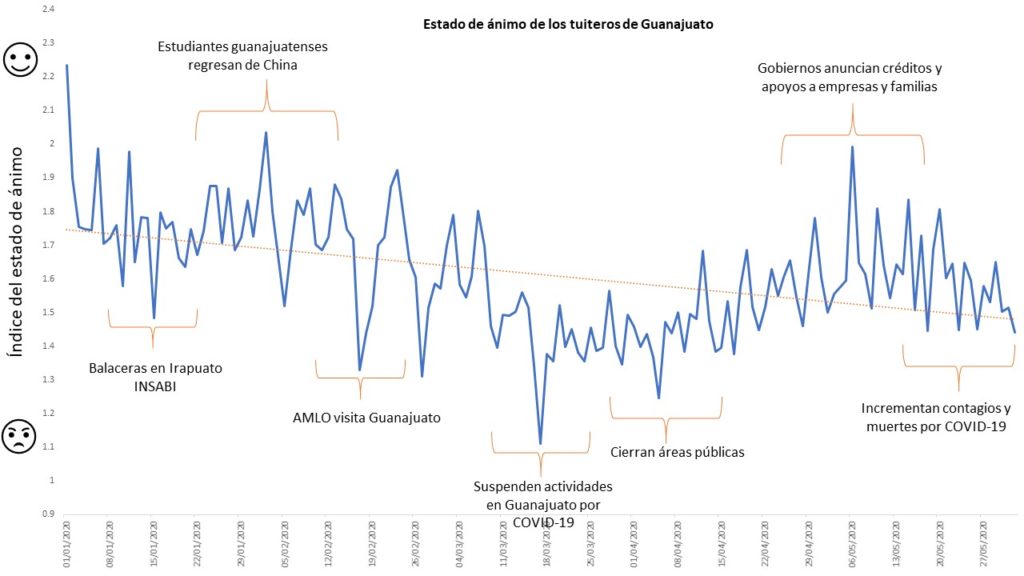 La pandemia de coronavirus, el aislamiento social y las primeras muertes de contagiados, provocaron que el ánimo de los tuiteros guanajuatenses cayera a su nivel más bajo desde que el Instituto de Estadística Geografía e Información (INEGI) comenzó el análisis de las publicaciones de la red social.