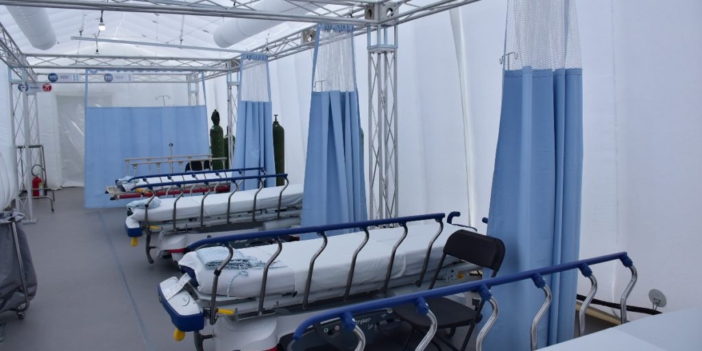 Este hospital de 3 mil metros cuadrados cuenta con varios módulos: cuatro áreas de choque, carros camillas, monitores e insumos médicos, 40 camas hospitalarias (que se suman a la infraestructura de más de 900 camas para pacientes con COVID-19), área de rayos x, ultrasonido y toma de muestras para laboratorio; cuenta también con una fuente de energía eléctrica, agua, drenaje y gases medicinales, así como la disposición adecuada de los residuos potencialmente biológico-infecciosos.