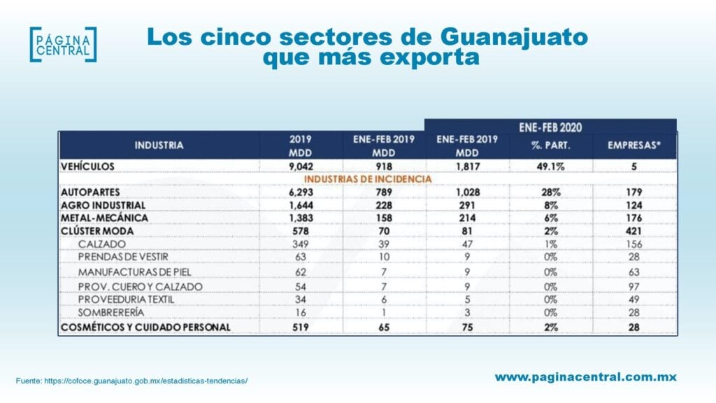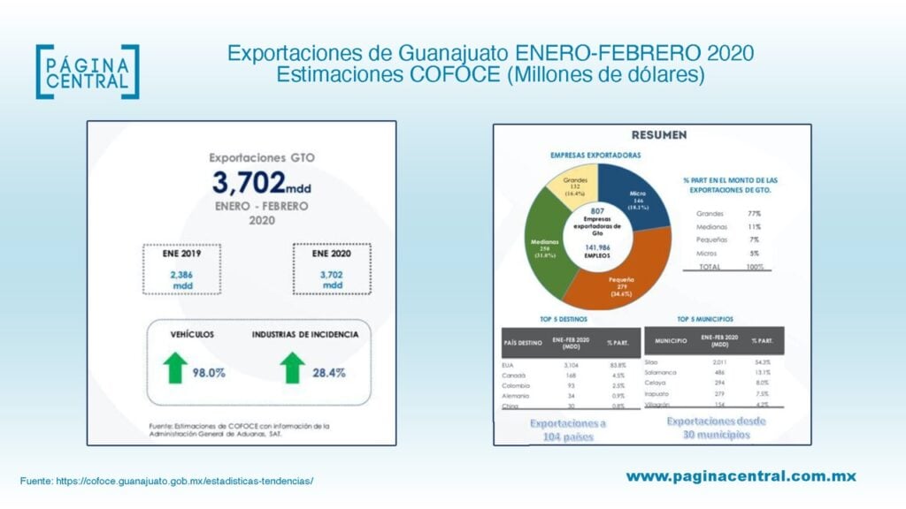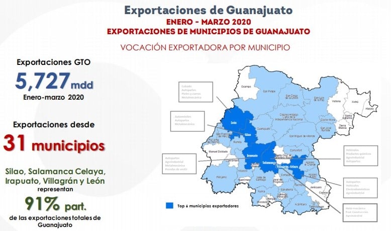 El 91% de la participación exportadora se centra en Silao, Salamanca, Celaya, Irapuato, Villagrán y León.