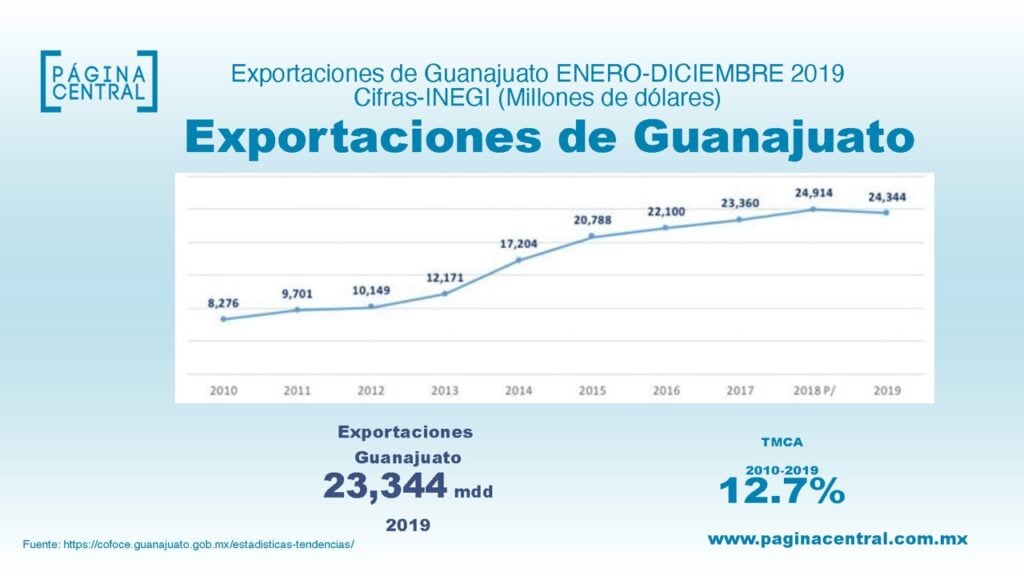 Antes del TLC las exportaciones de Guanajuato no alcanzaban los 250 millones de dólares; para 2012 la entidad rebasó la barrera de los dos dígitos, sumando 10 mil 149 millones de dólares en exportaciones, mientras que al cierre de 2019, la entidad cerró con cifras en el orden de más de 24 mil millones de dólares. Antes del TLC Guanajuato se ubicaba entre las 10 entidades más pobres.