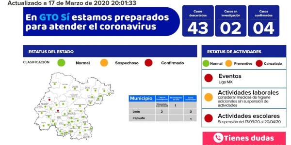 Estos dos nuevos casos se detectaron en Irapuato y León, sumándose a los dos anteriores detectados también en la ciudad leonesa. A través de redes sociales, Díaz Martínez dijo que siguiendo la política indicada por el gobernador del estado, Diego Sinhue Rodríguez Vallejo, de informar puntualmente sobre el Covid19, es que se confirmaba la existencia de dos nuevos casos que dieron positivo.Hasta el momento, la página implementada por el gobierno del estado, https://coronavirus.guanajuato.gob.mx/, destaca que hay 43 casos descartados, dos están bajo investigación y hay cuatro confirmados.