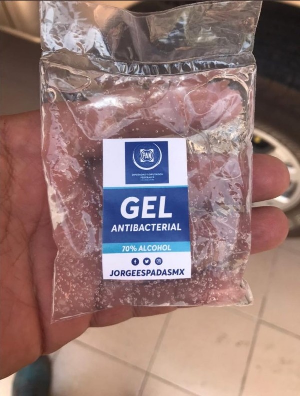 El coordinador de los diputados federales del Partido Acción Nacional por Guanajuato, Jorge Espadas Galván, entregó gel antibacterial a los leoneses cuyo producto tenía propaganda partidista.