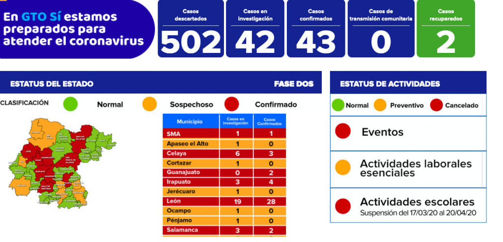 A través de la página coronavirusguanajuato.gob.mx el gobierno estatal y las autoridades de salud en la entidad, dan cuenta que hasta el momento hay 42 casos en investigación, 502 descartados, mientras que dos personas portadoras del Coronavirus, fueron dadas de alta porque vencieron la enfermedad.