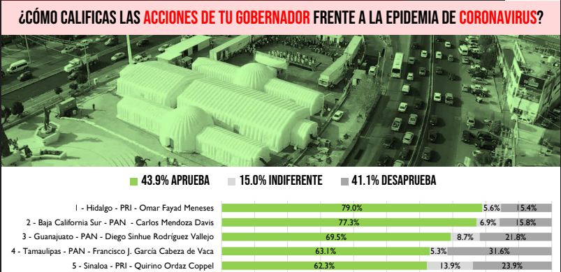 Guanajuato fue uno de los estados en los que mayor aprobación se tuvo en las acciones de gobierno estatal frente al Covid-19, solo por debajo de Hidalgo y Baja California Sur, y seguido por Tamaulipas y Sinaloa.
