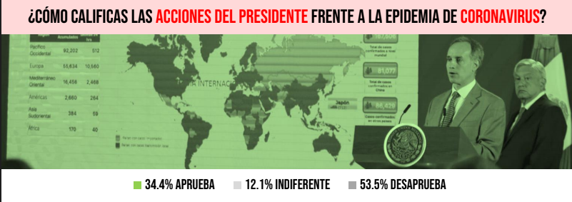 Por otro lado, se preguntó a los encuestados cómo calificarían las acciones del presidente frente a la epidemia, un 53.5% de los encuestados a nivel nacional, desaprueba sus acciones, frente a un 34.4% que sí las aprueba.