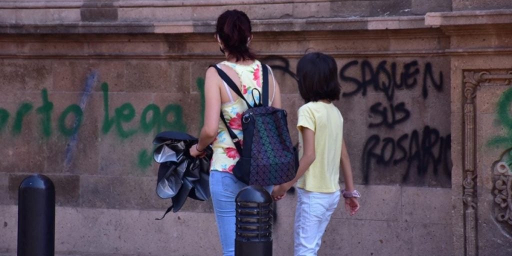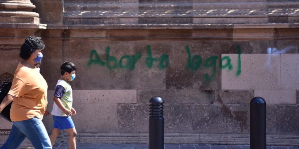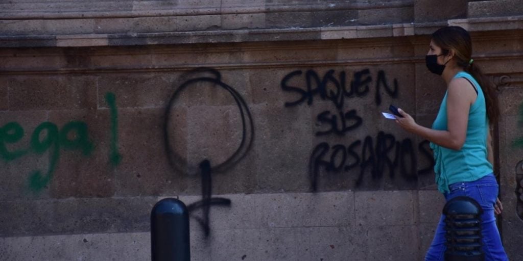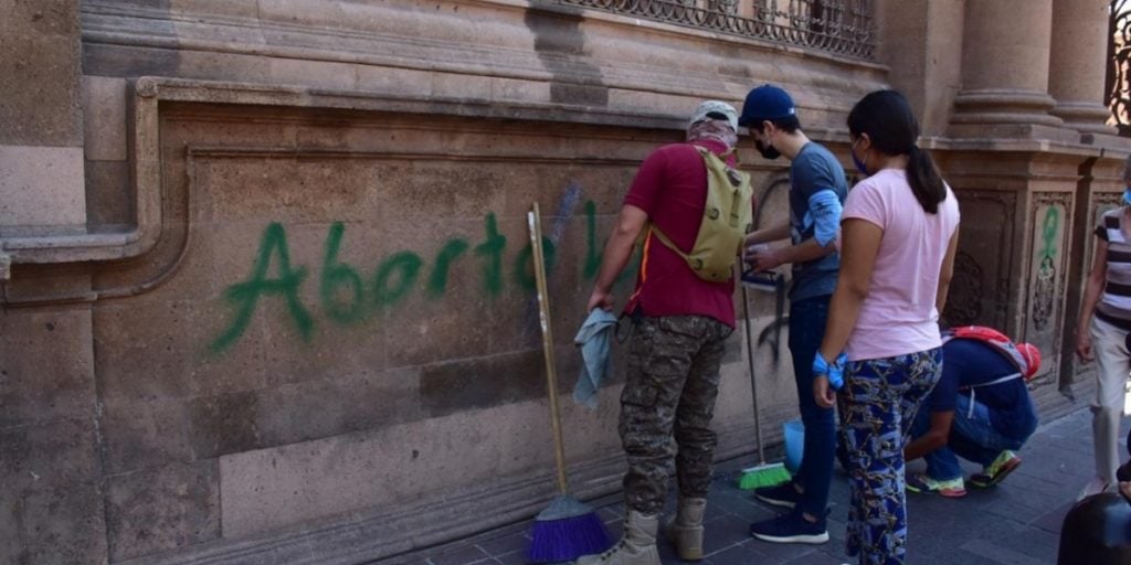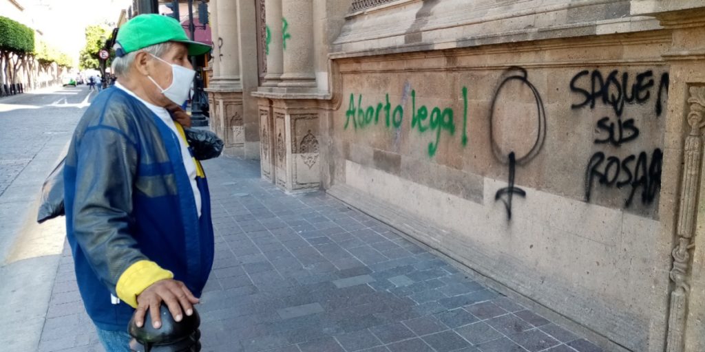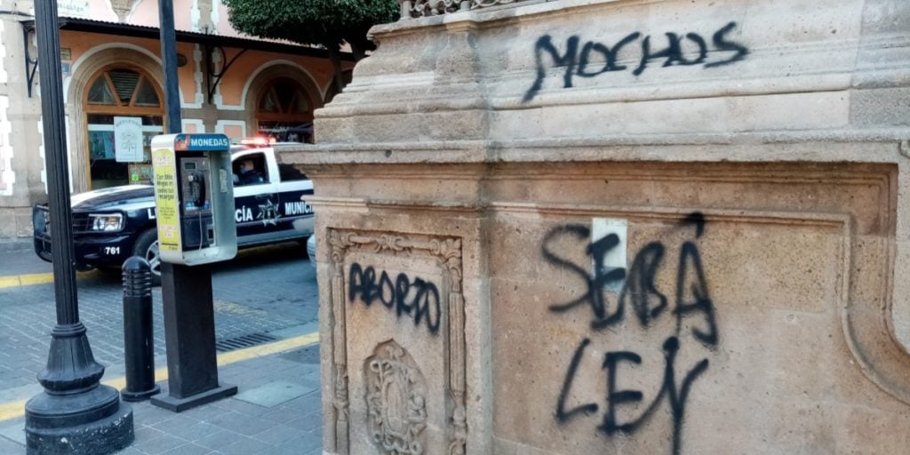 Pintas a favor del aborto legal en Guanajuato tiñeron de verde la fachada de la Catedral de León.