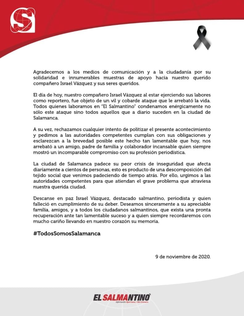 De acuerdo a información emitida por la Secretaría de Gobierno, se activaron los protocolos de intervención del Consejo Estatal para la Protección a Personas Defensoras de Derechos Humanos y Periodistas, en coordinación con el mecanismo Federal.“Se estableció contacto con los directivos de El Salmantino a fin de ofrecer acompañamiento y apoyo ante la situación”.A través de su cuenta de Twitter, el subsecretario de Gobierno, Alfonso Ruiz, dio a conocer que se ofreció apoyo y “acompañamiento” a la familia.En tanto, la Procuraduría Estatal de los Derechos Humanos inició de oficio el expediente de queja 187/20-B, con el objetivo de que el Ministerio Público, la Dirección de Seguridad Pública de Salamanca y el Hospital General de Salamanca, entregue un informe de los hechos y atención a la víctima.Adicionalmente, mediante el oficio SPI/2377/2020, se ha solicitado al secretario Técnico del Consejo Estatal de Protección de Personas Defensoras de Derechos Humanos y Periodistas de Guanajuato, adopten “medidas cautelares, las cuales tienen como objetivo primordial salvaguardar los derechos humanos de “Israel Vázquez Rangel y su familia”.SolidaridadEl gobernador del estado, Diego Sinhué Rodríguez Vallejo, lamentó y condenó “el hecho” a través de sus redes sociales.La Fiscalía General del Estado condena e investiga el homicidio de Israel “N” integrante del medio informativo digital “El Salmantino”; el reportero de fuente policiaca daba cobertura a un hallazgo criminal registrado la mañana de este lunes en la ciudad de Salamanca. pic.twitter.com/hdg5tGJZoT