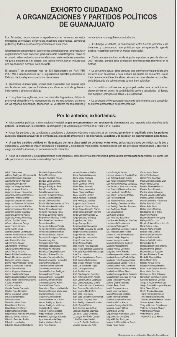 El desplegado firmado por ciudadanos y empresarios registra 273 firmas, entre las que destacan, el presidente de Concamin Bajío, Ismael Plascencia Núñez; el presidente de Coparmex, Alberto Ruenes Escoto; el presidente de Apimex, David Novoa Toscano; el expresidente de Canaco, Gabino Fernández; y el expresidente del CCEL, José Arturo Sánchez Castellanos; entre otros.