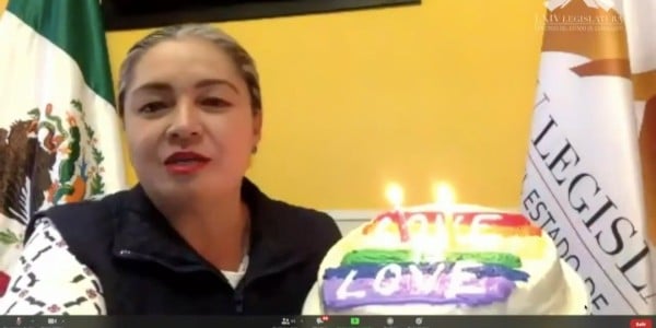 Durante su comparecencia, la diputada perredista Claudia Silva Campos sacó un pastel con los colores del arcoiris para festejar que hace dos años el también legislador perredista Isidoro Bazaldúa Lugo impulsó esta misma iniciativa.