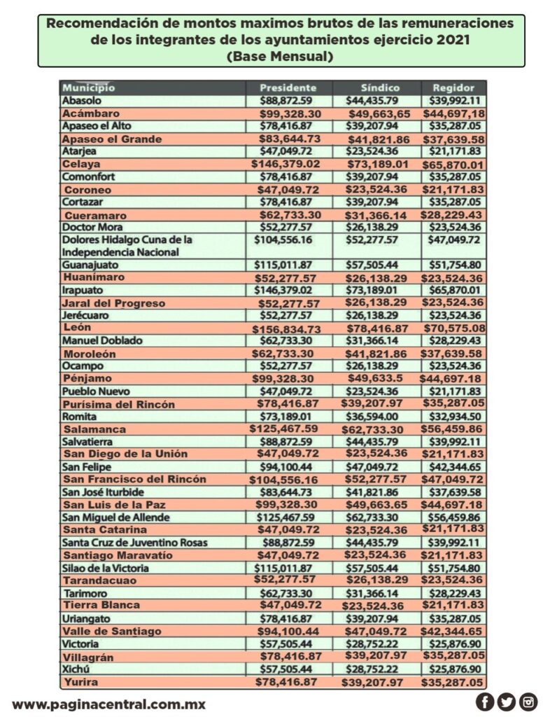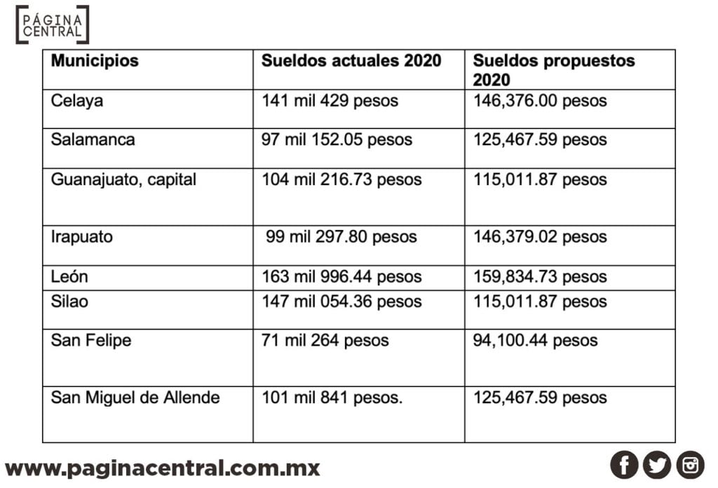 En el acuerdo emitido por el Legislativo propone sueldos superiores a los 100 mil pesos en los siguiente municipios: León ($156 mil 834), Celaya ($146 mil 376), Dolores Hidalgo ($104 mil 556), Guanajuato ($115 mil 011), Irapuato ($146 mil 379), Salamanca ($125 mil 476), San Francisco del Rincón ($104 mil 556), San Miguel de Allende ($125 mil 467) y Silao ($115 mil 011).