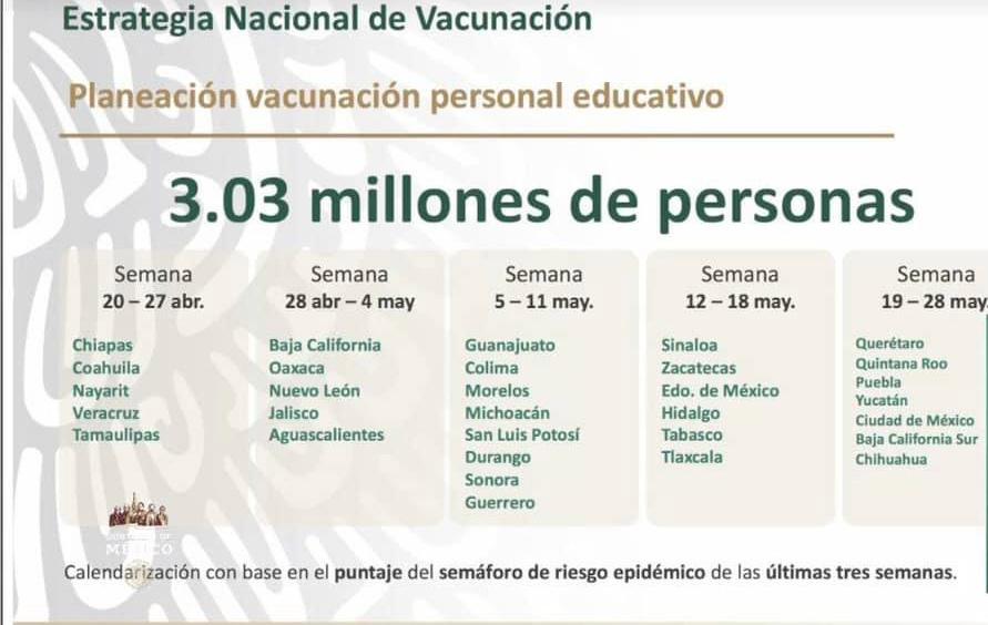 López-Gatell expresó que se vacunará al personal público y privado, de tal manera que el primer bloque del estado podrá regresar a clases presenciales a partir del 15 de mayo, y el segundo bloque a finales del mismo mes.