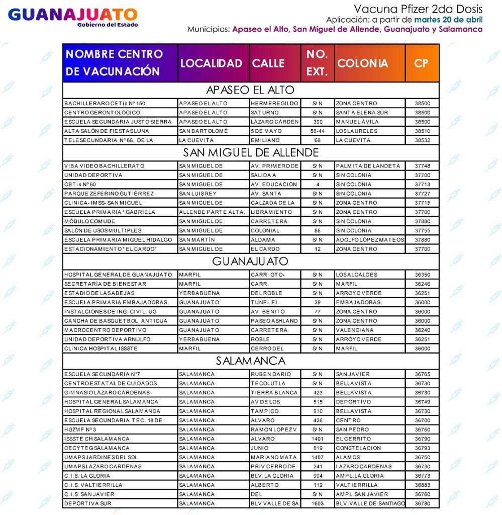 Los adultos mayores de 60 años de los municipios de Salamanca, Guanajuato, Apaseo el Alto y San Miguel de Allende recibirán a partir de este martes su segunda dosis de la vacuna antiCOVID19.